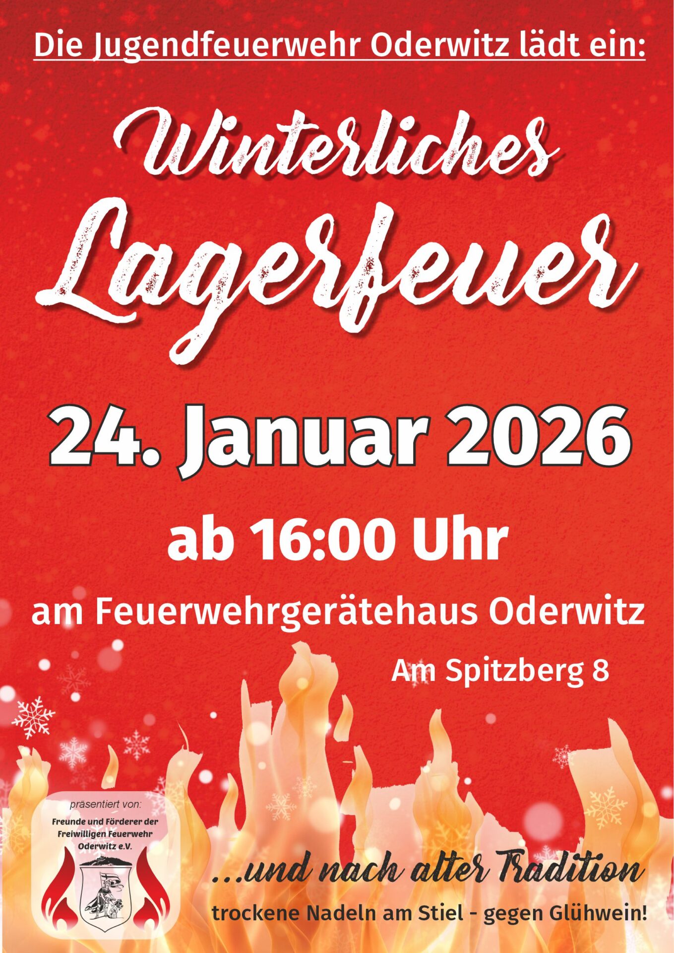 Auch in diesem Jahr lädt Sie die Jugendfeuerwehr sowie der Förderverein Freunde und Förderer der Freiwilligen Feuerwehr Oderwitz e.V. zum traditionellen winterlichen Lagerfeuer am Gerätehaus ein. Übrig gebliebenes Nadelgehölz (trocken & unbehandelt) wird für ein Freigetränk in Zahlung genommen. Darüber hinaus sorgt die Jugendfeuerwehr für das leibliche Wohl aller Gäste.