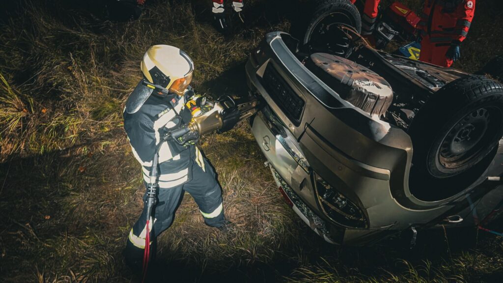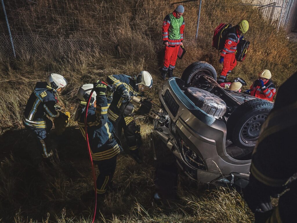 Innerhalb kürzester Zeit fanden sich die Kameraden im Feuerwehrdepot ein und eilten mit ihren Fahrzeugen zum Einsatz. Der Einsatzleiter traf mit dem Kommandowagen (KdoW) als erster an der Unfallstelle ein und führte umgehend eine Lageerkundung durch. Dabei konnte er einen verunfallten PKW, der nach dem Sturz von einer Böschung auf dem Dach lag und noch zwei eingeklemmte Insassen beinhaltete feststellen.