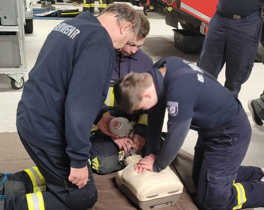 Nach dem Fachvortrag wurde noch das vorgehen und die richtige Versorgung bei stark blutenden Wunden, sowie die Reanimation (Herzdruckmassage) mit der Unterstützung eines sogenannten „AED“ (automatisierter externer Defibrillator) geübt.