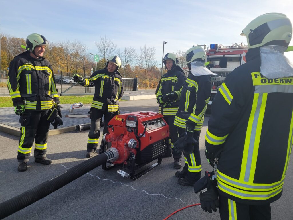 Früh begann die Ausbildung mit dem Aufbau einer sogenannten „offenen Wasserentnahmestelle“. Als offene Wasserentnahmestelle bezeichnet man beispielsweise einen Teich oder einen Fluss. Dabei wurden auch der Aufbau und die Inbetriebnahme unserer Tauchpumpe geübt. Im Anschluss wurde die Rettung einer Person aus einem Schacht bzw. aus unwegsamen Gelände geübt.